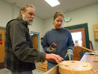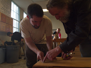 Class continues apace as we learn more about the nature and structure of wood, how to use chairmaking tools (such as travishers, spokeshaves, and drawknives), while continuing to learn about the students and instructors. Today was fast-paced and much was accomplished. Everyone's stool legs are fitted into the stool seats, and holes for the stretchers marked and drilled. Soon we will fit the stretchers, trim them all up, and the world will have 9 more stools than it did previously. Here is hoping that the moving box containing my camera is revealed soon! In the meantime, these are some photos taken by Tim Lawson. I should also point out that I learned today that there is still space left in Peter Follansbee's upcoming course, Make a Joint Stool From a Tree. This would be a killer opportunity to take a course in the beautiful Pacific Northwest with one of New England's most interesting traditional woodworkers.